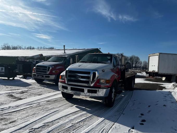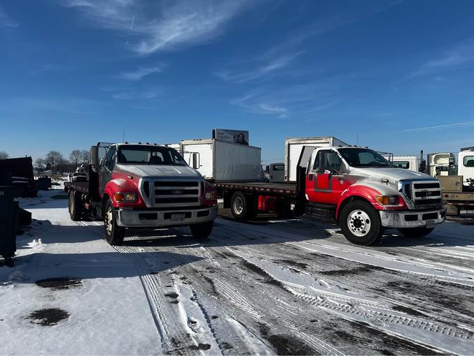 4005, 2 2015 FORD F650'S, NON CDL, 25500 GVW, 6.7 CUMMINS, ALLISON 2200 RDS W/ PTO GEAR! HYD BRAKES, 16' STEEL FLATBEDS, CALIFORNIA TRUCKS NO RUST, TRUCKS ARE WHITE WITH RED/GREY WRAP. 144-188K MI, $15500 EACH